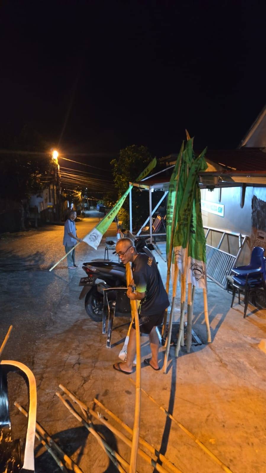 pengurus masjid al-ihsan melakukan pemasangan umbul-umbul dalam menyambut bulan Bulan suci Ramadhan 1447H